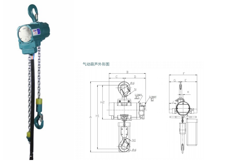 滬工工業(yè)用掛鉤式氣動葫蘆參數(shù):